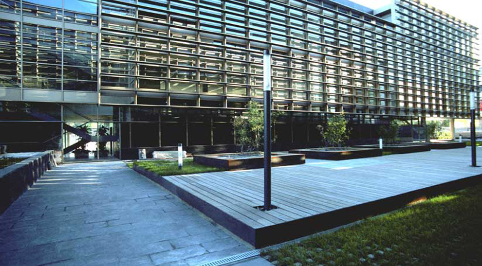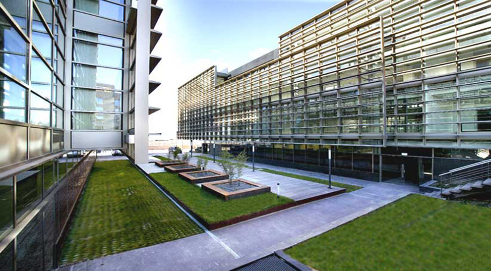 Patios ajardinados entre los edificios y fachada tecnológica de lamas de aluminio, estudiada para evitar el soleamiento directo del interior y garantizar la privacidad entre edificios.